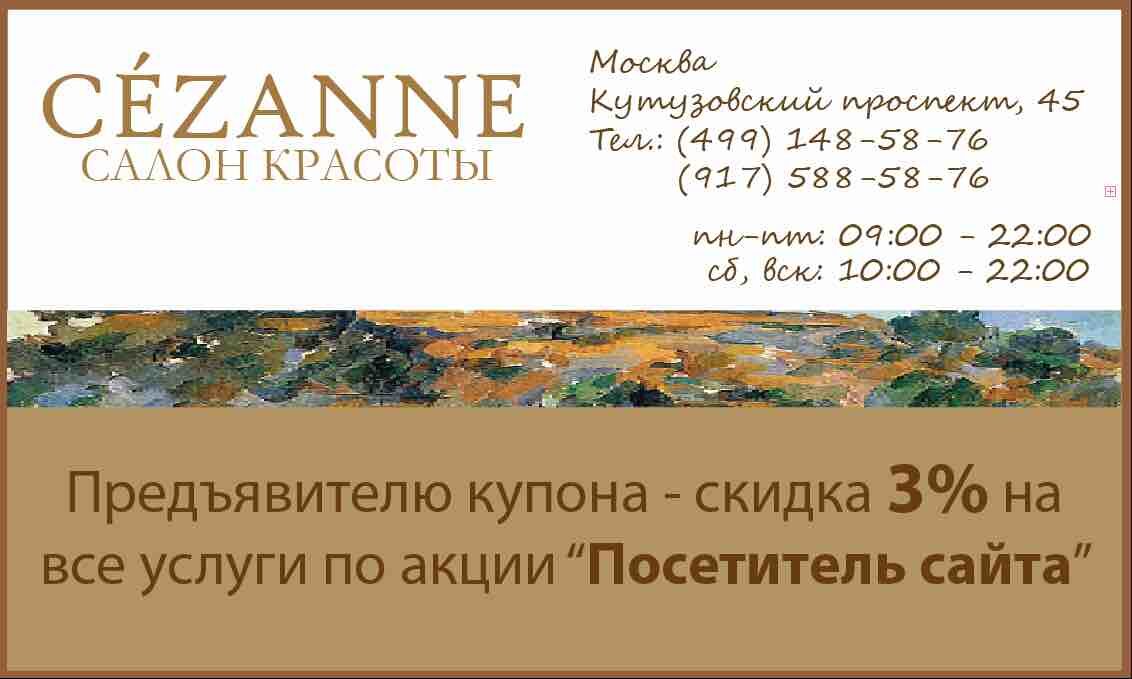 Всем посетителям нашего сайта мы предоставляем скидку в размере 3%* на все услуги. Для получения скидки распечатайте купон или сфотографируйте его на мобильный телефон и предъявите администратору салона при оплате услуг. Также обращаем Ваше внимание на акцию для наших продписчиков в соцсетях, по которой Вы можете получать постоянную скидку 5%* на все услуги! Подробнее... * Скидка не суммируется со скидкой по дисконтной карте салона и со скидками по другим акциям (бОльшая скидка поглощает меньшую). |